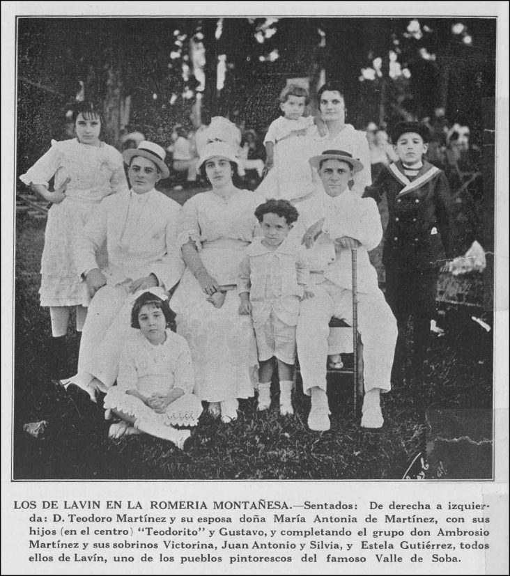 LOS DE LAVÍN EN LA ROMERÍA MONTAÑESA.- Sentados: De derecha a izquierda: D. Teodoro Martínez y su esposa doña María Antonia de Martínez, con sus hijos (en el centro) «Teodorito» y Gustavo y completando el grupo D. Ambrosio Martínez y sus sobrinos Victorina, Juan Antonio y Silvia, y Estela Gutiérrez, todos ellos de Lavín, uno de los pueblos pintorescos del famoso Valle de Soba.