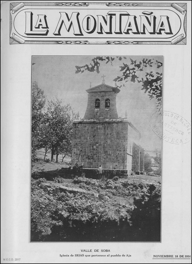 VALLE DE SOBA.- Iglesia de IRÍAS que pertenece al pueblo de Aja. La Montaña: revista semanal de la colonia montañesa; Año I Número 47 – Habana 18 de Noviembre de 1916.