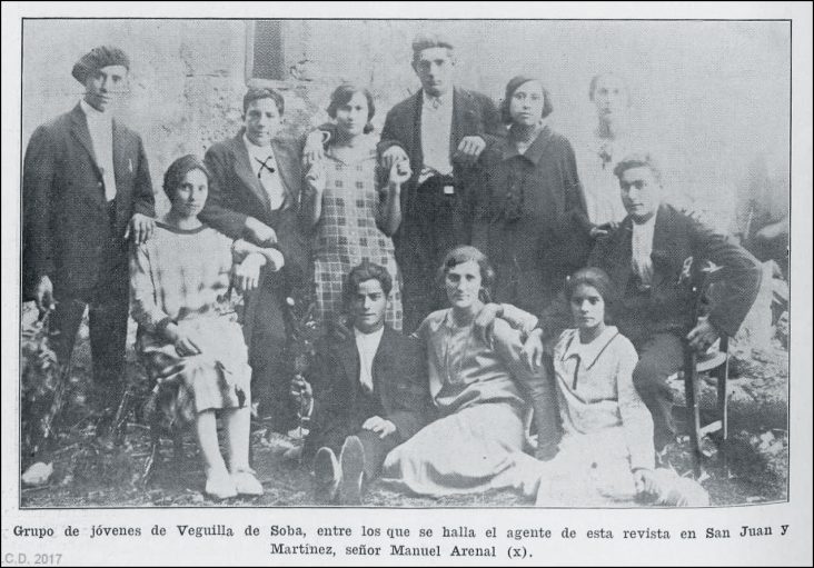 Grupo de jóvenes de Veguilla de Soba, entre los que se halla el agente de esta revista en San Juan y Martínez, señor Manuel Arenal (x). La Montaña: revista semanal de la colonia montañesa; Año XV. Número 13. Habana 15 de Julio de 1930.