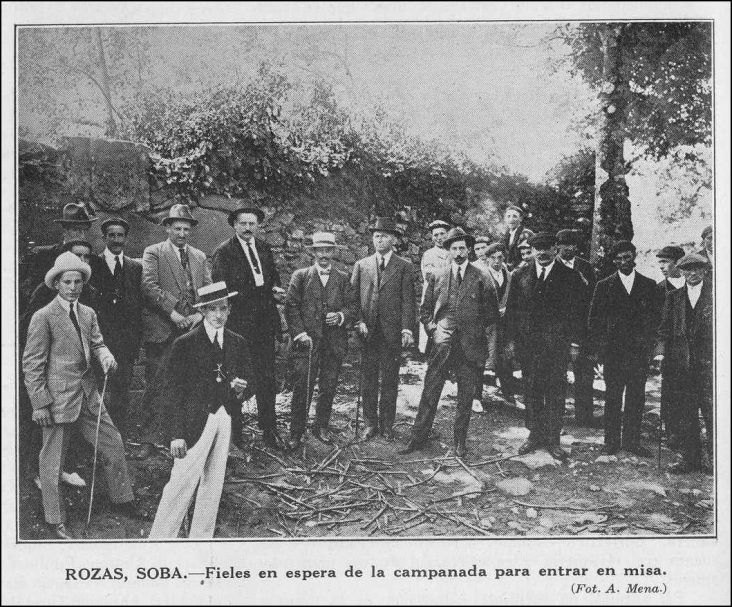 1919. Rozas. Soba. Fieles en espera de la campanada para entrar en misa. (Foto A. Mena). La Montaña: revista semanal de la colonia montañesa; Año IV Número 15 – Habana 12 de Abril de 1919.