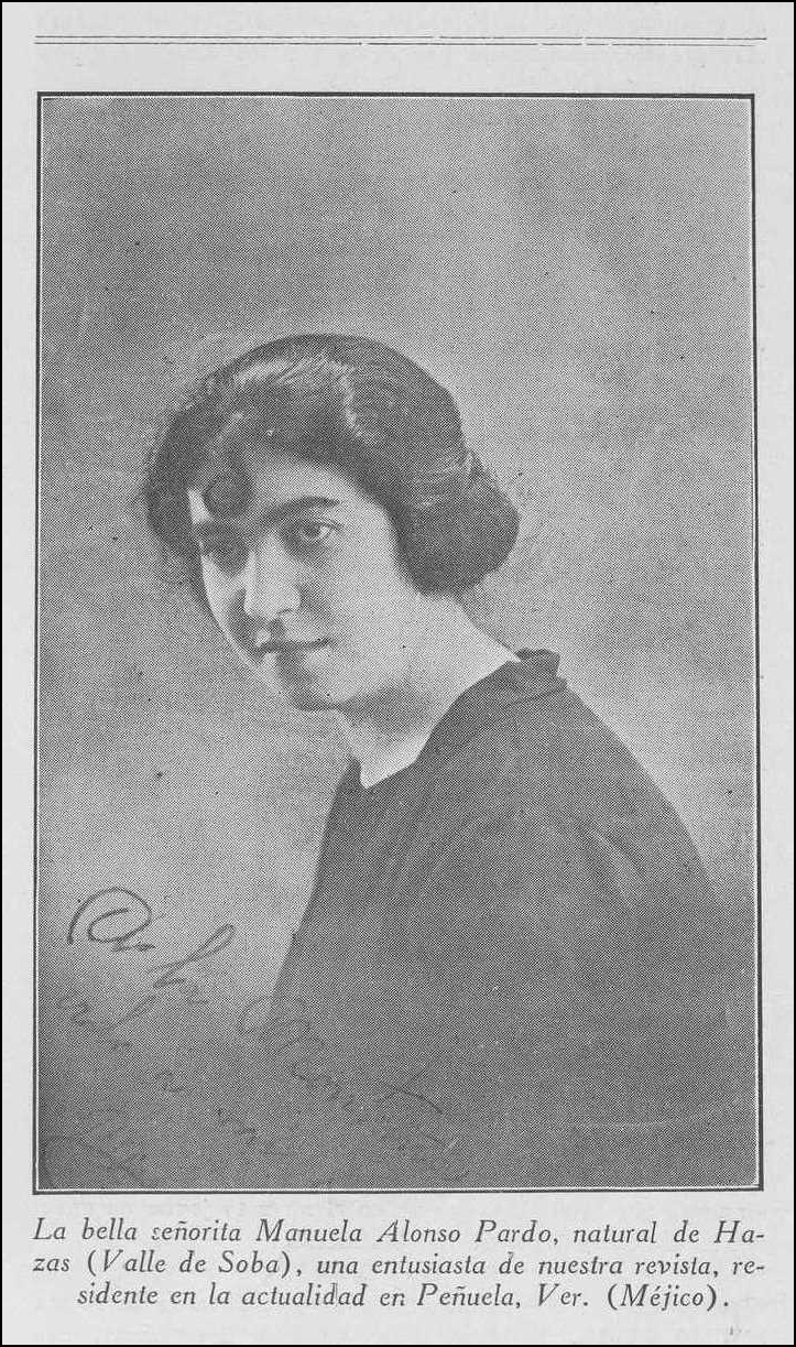 1926. La bella señorita Manuela Alonso Pardo, natural de Hazas (Valle de Soba), una entusiasta de nuestra revista, residente en la actualidad en Peñuela, Veracruz, México. La Montaña: revista semanal de la colonia montañesa; Año XI Número 18 – Habana 30 de Junio de 1926.