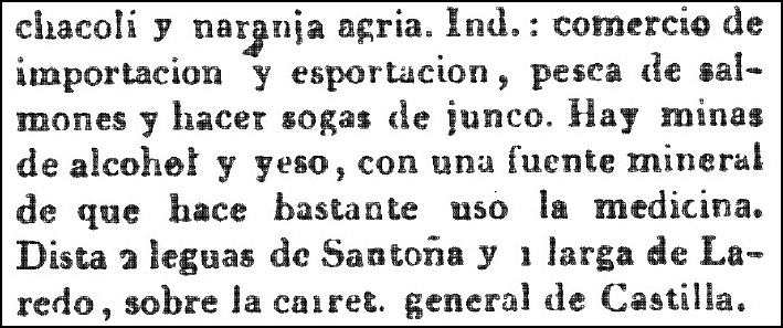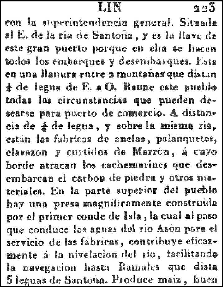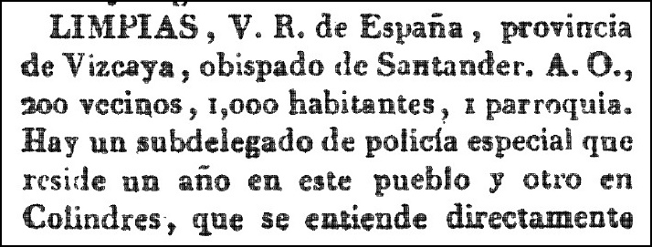 LIMPIAS, V. R. de España, provincia de Vizcaya, obispado de Santander. A. O., 200 vecinos, 1,000 habitantes, I parroquia. Hay un subdelegado de policía especial que reside un año en este pueblo y otro en Colindres, que se entiende directamente con la superintendencia general. Situada al E. de la ría de Santoña, y es la llave de este gran puerto porque en ella se hacen todos los embarques y desembarques. Esta en una llanura entre 2 montañas que distan 1/4 de legua de E. a O. Reúne este pueblo todas las circunstancias que pueden desearse para puerto de comercio. A distancia de 1/4 de legua, y sobre la misma ría, están las fábricas de anclas, palanquetas, clavazón y curtidos de Marrón, á cuyo borde atracan los cachemarines que desembarcan el carbón de piedra y otros materiales. En la parte superior del pueblo hay una presa magníficamente construida por el primer conde de Isla, la cual al paso que conduce las aguas del río Asón para el servicio de las fábricas, contribuye eficazmente á la nivelación del río, facilitando la navegación hasta Ramales que dista 5 leguas de Santoña. Produce maíz, buen chacolí y naranja agria. Ind. : comercio de importación y exportación, pesca de salmones y hacer sogas de junco. Hay minas de alcohol y yeso, con una fuente mineral de que hace bastante uso la medicina. Dista 2 leguas de Santoña y 1 larga de Laredo, sobre la carretera general de Castilla.