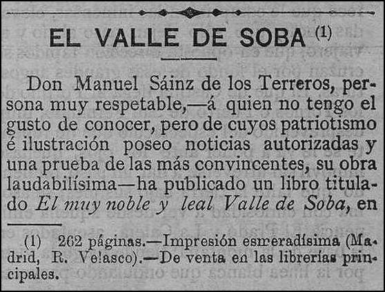 Don Manuel Sainz de los Terreros, persona muy respetable,-á quien no tengo el gusto de conocer, pero de cuyos patriotismo é ilustración, poseo noticias autorizadas y una prueba de las más convincentes, su obra laudabilísima- ha publicado El muy noble y leal Valle de Soba, en el cual, con un deseo grande de que todos sepan qué historia tiene y qué gentes y qué cosas encierra aquel pedazo de la Montaña, va contando al lector cuáles son las condiciones y cuál es el aspecto de aquel país bellísimo, cuáles sus riquezas, cuántos sus santuarios, cómo las costumbres de sus habitantes, por qué caminos se comunican, qué ríos le humedecen, qué límites le cierran, de cuáles maneras se gobiernan los sobanos, cómo andan en punto á ilustración, á donde llegaron en hechos historiables sus ascendientes, quiénes de éstos se distinguieron por sus méritos… Libro es éste que honra como la obra mejor á quien le ha escrito; que encierra datos curiosísimos, en el que aparece tal como es el Valle, en el que se dice lo que fue en tiempos pasados, y por el que se conjetura los que podría ser en los futuros.