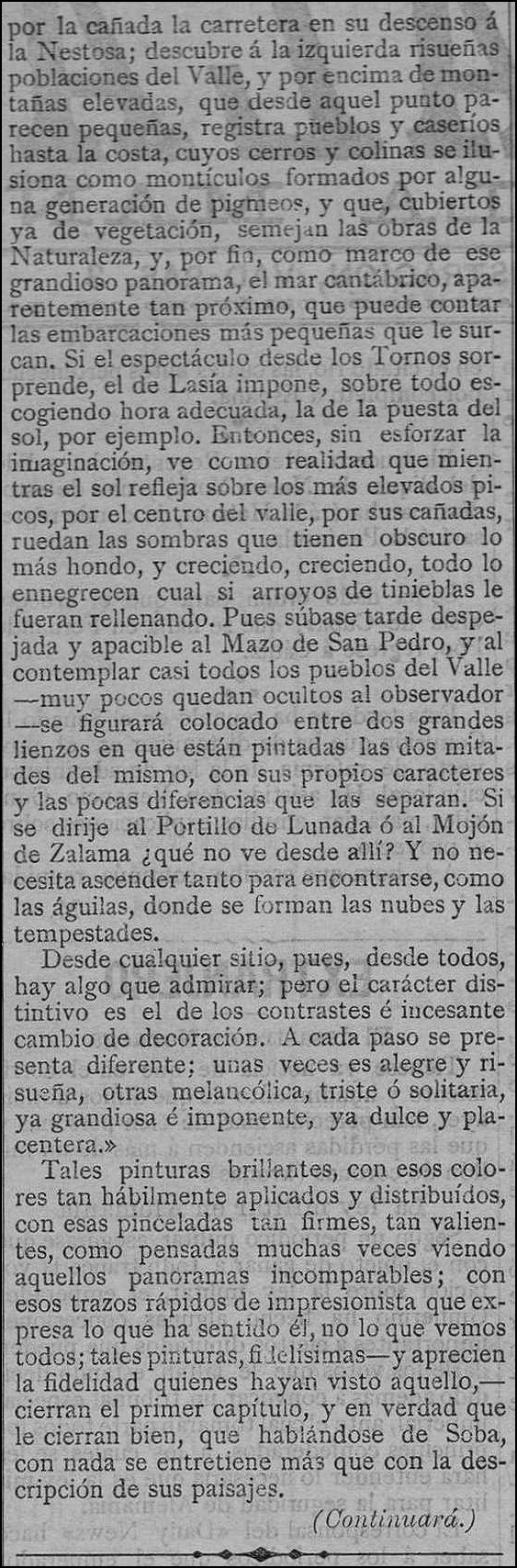 Tales pinturas brillantes, con esos colores tan hábilmente aplicados y distribuídos, con esas pinceladas tan firmes, tan valientes, como pensadas muchas veces viendo aquellos panoramas incomparables; con esos trazos rápidos de impresionista que expresa lo que ha sentido él, no lo que vemos todos; tales pinturas, fidelísimas- y aprecien la fidelidad quienes hayan visto aquello,-cierran el primer capítulo, y en verdad que le cierran bien, que hablándose de Soba, con nada se entretiene más que con la descripción de sus paisajes.