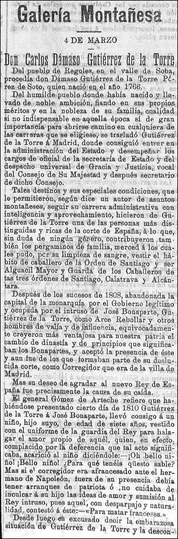 Del pueblo de Regules, en el valle de Soba, procedía D. Dámaso Gutiérrez de la Torre y Pérez de Soto, quien nació en el año 1766.