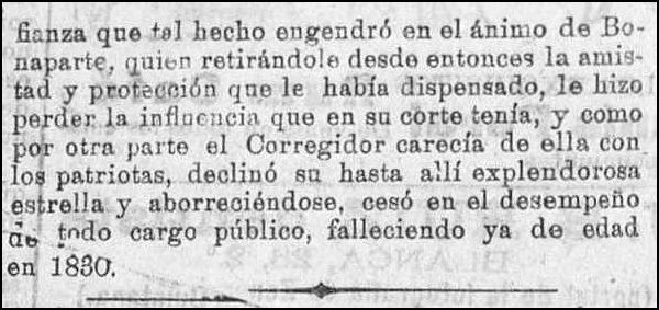 Desde luego es excusado decir la embarazosa situación de Gutiérrez dela Torre y la desconfianza que tal hecho engendró en el ánimo de Bonaparte, quien retirándole desde entonces la amistad y protección que le había dispensado, le hizo perder la influencia que en su corte tenía, y como por otra parte el Corregidor carecía de ella con los patriotas, declinó su hasta allí explendorosa estrella y aborreciéndose, cesó en el desempeño de todo cargo público, falleciendo ya de edad en 1830.