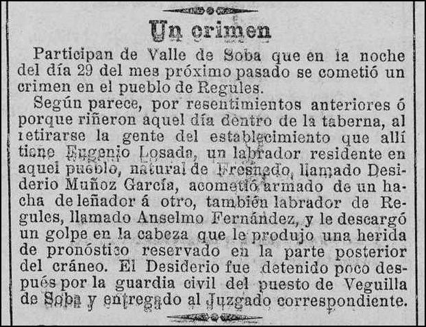 Según parece, por resentimientos anteriores ó porque riñeron aquel día dentro de la taberna, al retirarse la gente del establecimiento que allí tiene Eugenio Losada, un labrador residente en aquel pueblo, natural de Fresnedo, llamado Desiderio Muñoz García, acometió armado de un hacha de leñador á otro, también labrador de Regules, llamado Anselmo Fernández, y le descargó un golpe en la cabeza que le produjo una herida de pronóstico reservado en la parte posterior del cráneo. El Desiderio fue detenido poco después por la guardia civil del puesto de Veguilla de Soba y entregado al Juzgado correspondiente,
