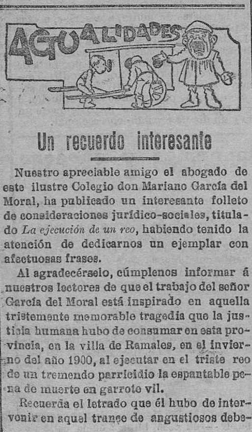Al agradecérselo, cúmplenos informar á nuestros lectores de que el trabajo del señor García del Moral está inspirado en aquella tristemente memorable tragedia que la justicia humana hubo de consumar en esta provincia, en la villa de Ramales, en el invierno del año de 1900, al ejecutar en el triste reo de un tremendo parricidio la espantable pena de muerte en garrote vil.