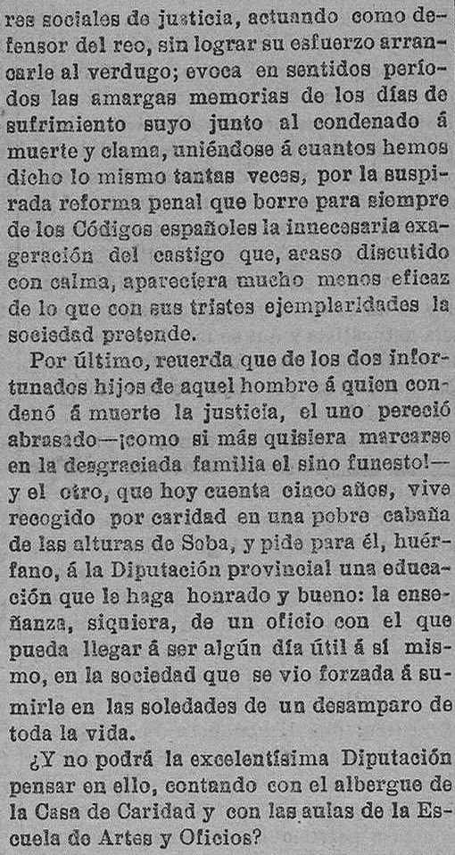 Por último, recuerda que de los dos infortunados hijos de aquel hombre á quien condenó á muerte la justicia, el uno pereció abrasado-¡como si más quisiera marcarse en la desgracia familia el sino funesto!- y el otro, que hoy cuenta cinco años, vive recogido por caridad en una pobre cabaña de las alturas de Soba, y pide para él, huérfano, á la Diputación provincial una educación que le haga honrado y bueno: la enseñanza, siquiera, de un oficio con el que pueda llegar á ser algún día útil á sí mismo, en la sociedad que se vio forzada á sumirle en las soledades de un deasmparo de toda la vida.