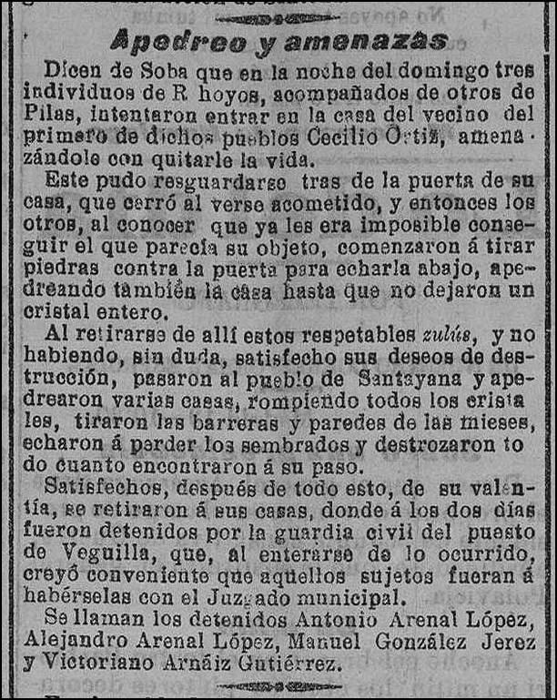 Dicen de Soba que en la noche del domingo tres individuos de Rehoyos, acompañados de otros de Pilas, intentaron entrar en la casa del vecino del primero de dichos pueblos Cecilio Ortiz, amenazándole con quitarle la vida.