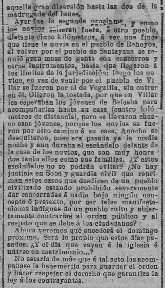Ayer fue la segunda proclama, y como los novios salieran fuera, á otro pueblo, distante cinco kilómetros, á ver una finca que tiene la novia en el pueblo de Rehoyos, al volver por el pueblo de Santayana se reunió gran masa de gente con cencerros y otros instrumentos, hasta que llegaron á los límites de la jurisdicción; luego los novios, en vez de venir por el pueblo de Villar se fueron por el de Veguilla, sin entrar en él. Olieron la tostada, por que en Villar les esperaban los jóvenes de Balcaba para acompañarles hasta su casa (cuatro kilómetros de distancia), pero se llevaron chasco esos jóvenes, porque los novios se fueron por otro camino á su casa. Anoche se desquitaron, pues era pasada ya la media noche y aun duraba el escándalo delante de la casa de los novios, que son muy honrados tanto ellos como sus familias. ¿Y estos escándalos no se podrían evitar? ¿No hay justicia en Soba y guardia civil que repriman estos casos que desdicen de un pueblo civilizado estando prohibido severamente dar cencerradas á nadie bajo ningún concepto ó pretexto, por ser tales manifestaciones indignas de un pueblo culto y abiertamente contrarias al orden público y al respeto que se debe á los ciudadanos?.