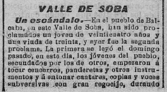 Un escándalo.- En el pueblo de Balcaba, en este Valle de Soba, han sido proclamados un joven de veinticuatro años y una viuda de treinta, y ayer fue la segunda proclama. La primera se leyó el domingo pasado, en este día, los jóvenes del pueblo, secundados por los de otros, empezaron a tocar cencerros, panderetas y otros instrumentos y á entonar cantares, coplas y voces subversivas con gran regocijo, durando aquella gran diversión hasta las dos de la madrugada del lunes.