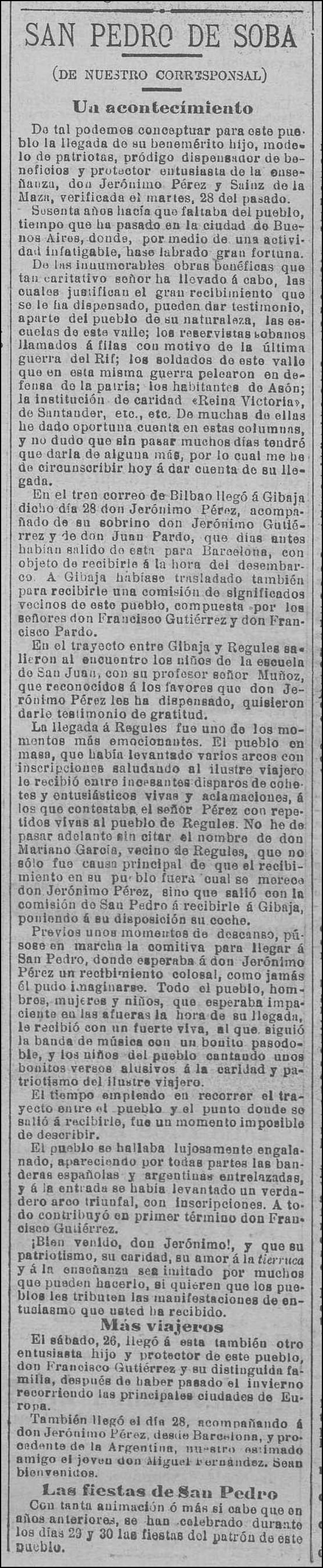En el tren correo de Bilbao llegó á Gibaja dicho día 28 D. Jerónimo Pérez, acompañado de su sobrino D. Jerónimo Gutiérrez y de D. Juan Pardo, que días antes habían salido de esta para Barcelona, con objeto de recibirle á la hora del desembarco. A Gibaja habíase trasladado también para recibirle una comisión de significados vecinos de este pueblo, compuesta pr los señores D. Francisco Gutiérrez y D. Francisco Pardo.