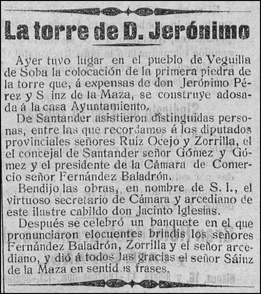 Ayer tuvo lugar en el pueblo de Veguilla de Soba la colocación de la primera piedra de la torre que, á expensas de D. Jerónimo Pérez y Sainz de la Maza, se construye adosada á la casa Ayuntamiento.