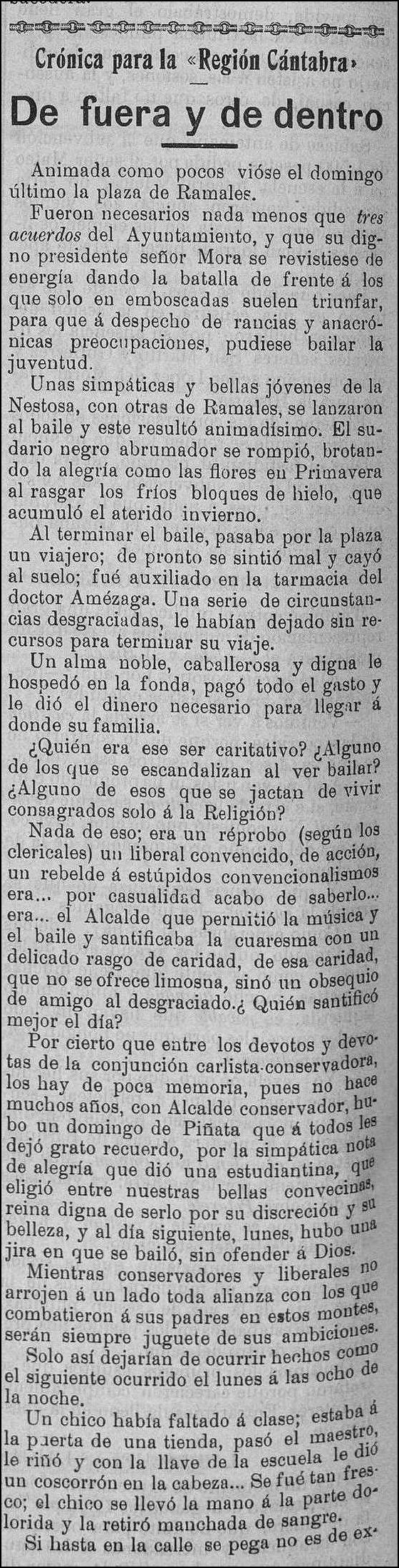 Unas simpáticas y bellas jóvenes de la Nestosa, con otras de Ramales, se lanzaron al baile y este resultó animadísimo. El sudario negro abrumador se rompió, brotando la alegría como las flores en Primavera al rasgar los fríos bloques de hielo, que acumuló el aterido invierno.