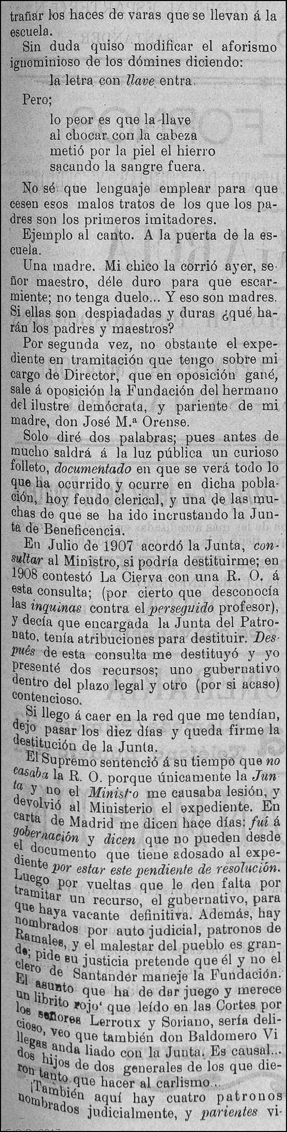 En Julio de 1907 acordó la Junta, consultar al Ministro, si podría destituirme; en 1908 contestó La Cierva con una R. O. á esta consulta; (por cierto que desconocía las inquinas contra el perseguido profesor), y decía que encargada la Junta del Patronato, tenía atribuciones para destituir. Después de esta consulta me destituyó y yo presenté dos recursos; uno gubernativo dentro del plazo legal y otro (por si acaso) contencioso.