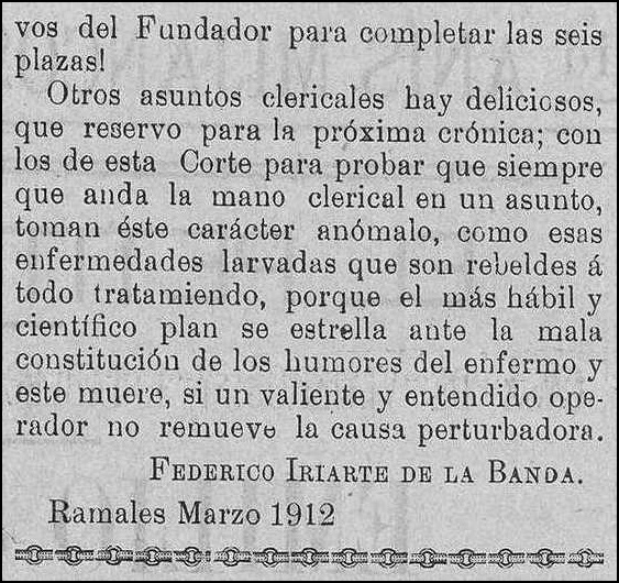 Otros asuntos clericales hay deliciosos, que reservo para la próxima crónica; con los de esta Corte para probar que siempre que anda la mano clerical en un asunto, toman éste carácter anómalo, como esas enfermedades larvadas que son rebeldes á todo tratamiento, porque el más hábil y científico plan se estrella ante la mala constitución de los humores del enfermo y este muere, si un valiente y entendido operdador no remueve la causa perturvadora.