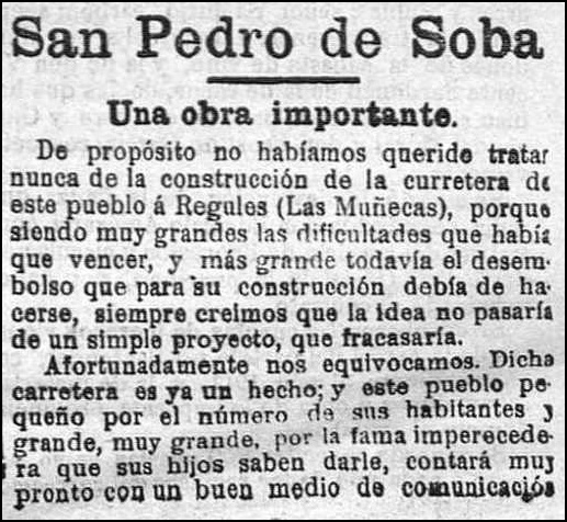 De propósito no habíamos querido tratar nunca de la construcción de la carretera de este pueblo á Regules (Las Muñecas), porque siendo muy grandes las dificultades que había que vencer, y más grande todavía el desembolso que para su construcción debía de hacerse, siempre creímos que la idea no pasaría de un simple proyecto, que fracasaría.