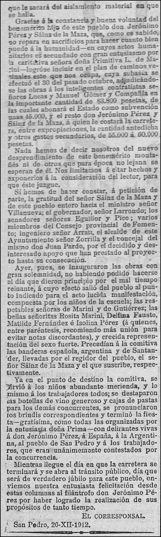 Gracias á la constancia y buena voluntad del benemérito hijo de este pueblo D. Jerónimo Pérez y Sainz de la Maza, que, como es sabido, no repara en sacrificios para hacer cuanto bien puede á la humanidad-en cuyos actos humanitarios es secundado con gran entusiasmo por la caritativa señora doña Primitiva L. de Marini-logróse incluir en el plan de caminos vecinales este que nos ocupa, cuya subasta se efectuó el 30 del pasado octubre, adjudicándose las obras á los inteligentes contratistas señores Lucas y Manuel Gómez y Compañía en la importante cantidad de 83.800 pesetas, de las cuales abonará el Estado como subvención unas 45.000, y el resto D. Jerónimo Pérez y Sainz de la Maza, a quien le costará la carretera, entre expropiaciones, la cantidad antedicha y otro gastos secundarios, de 55.000 á 60.000 pesetas.