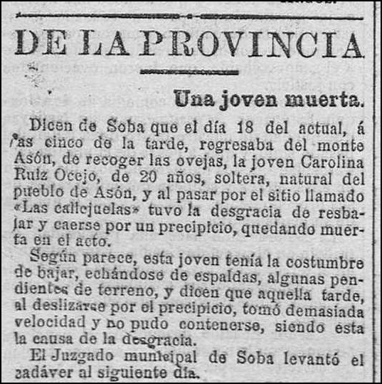 Dicen de Soba que el día 18 del actual, á las cinco de la tarde, regresaba del monte Asón, de recoger las ovejas, la joven Carolina Ruiz Ocejo, de 20 años, soltera, natural del pueblo de Asón, y al pasar por el sitio llamado «Las callejuelas» tuvo la desgracia de resbalar y caerse por un precipicio, quedando muerta en el acto.
