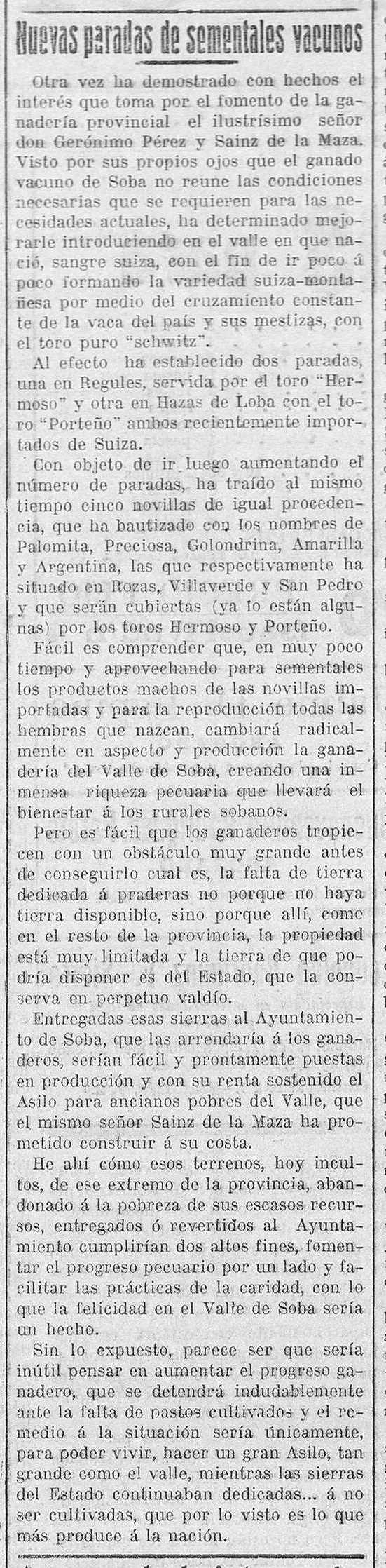 Otra vez ha demostrado con hechos el interés que toma por el fomento de la ganadería provincial el ilustrísimo señor D. Gerónimo Pérez y Sainz de la Maza. Visto por sus propios ojos que el ganado vacuno de Soba no reune las condiciones necesarias que se requieren para las necesidades actuales, ha determinado mejorarle introduciendo en el valle en que nació, sangre suiza, con el fín de ir poco á poco formando la variedad suiza-montañesa por medio del cruzamiento constante de vaca del país y sus mestizas con el toro puro «schwitz».