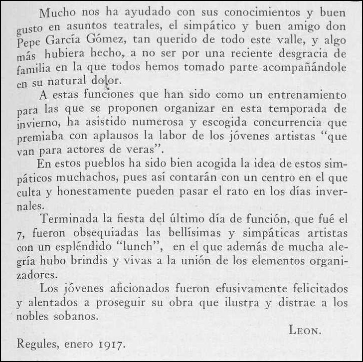 Mucho nos ha ayudado con sus conocimientos y buen gusto en asuntos teatrales, el simpático y buen amigo D. Pepe García Gómez, tan querido de todo este valle, y algo más hubiera hecho, a no ser por una reciente desgracia de familia en la que todos hemos tomad parte acompañándole en su natural dolor.