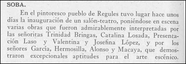 En el pintoresco pueblo de Regules tuvo lugar hace unos días la inauguración de un salón-teatro, poniéndose en escena varias obras que fueron admirablemente interpretadas por las señoritas Trinidad Bringas, Catalina Losada, Presentación Laso y Valentina y Josefina López, y por los señores García, Hermosilla, Alonso y Macaya, que demostraron excepcionales aptitudes para el arte escénico.