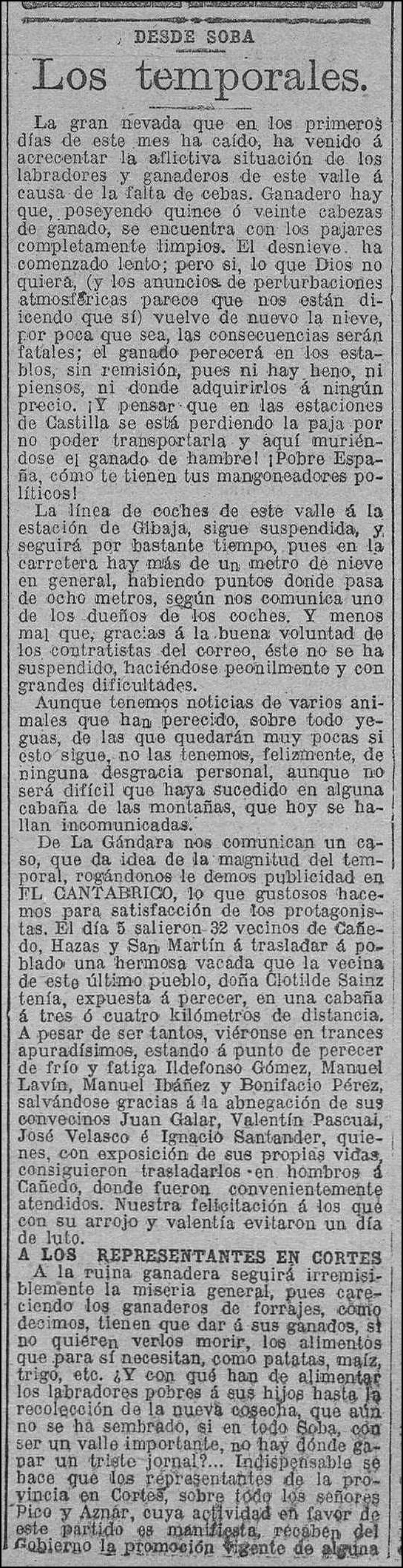 De La Gándara nos comunican un caso, que da idea de la magnitud del temporal, rogándonos le demos publicidad en EL CANTÁBRICO, lo que gustosos hacemos para satisfacción de los protagonistas. El día 5 salieron 32 vecinos de Cañedo, Hazas y San Martín á trasladar á poblado una hermosa vacada que la vecina de este último pueblo, doña Clotilde Sainz tenía, expuesta á perecer, en una cabaña á tres ó cuatro kilómetros de distancia. A pesar de ser tantos, viéronse en trances apuradísimos, estando á punto de perecer de frío y fatiga Ildefonso Gómez, Manuel Lavín, Manuel Ibáñez y Bonifacio Pérez, salvándose gracias á la abnegación de sus convecinos Juan Galar, Valentín Pascual, José Velasco é Ignacio Santander, quienes, con exposición de sus propias vidas, consiguieron trasladarlos en hombros á Cañedo, donde fueron convenientemente atendidos. Nuestra felicitación á los que con su arrojo y valentía evitaron un día de luto.