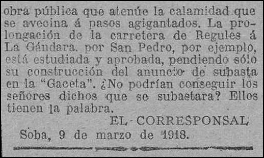 A la ruina ganadera seguirá irremisiblemente la miseria general, pues careciendo los ganaderos de forrajes, como decimos, tienen que dar á sus ganados, si no quieren verlos morir, los alimentos que para sí necesitan, como patatas, maíz, trigo, etc. ¿Y con qué han de alimentar los labradores pobres á sus hijos hasta la recolección de la nueva cosecha, que aún no se ha sembrado, si en todo Soba, con ser un valle importante, no hay dónde ganar un triste jornal?… Indispensable se hace que los representantes de la provincia en Cortes, sobre todo los señores Pico y Aznar, cuya actividad en favor de este partido es manifiesta, recaben del Gobierno la promoción vigente de alguna obra pública que atenúe la calamidad que se avecina á pasos agigantados. La prolongación de la carretera de Regules á La Gándara por San Pedro, por ejemplo, está estudiada y aprobada, pendiendo sólo su construcción del anuncio de subasta en la «Gaceta». ¿No podrían conseguir los señores dichos que se subastara?. Ellos tienen la palabra.