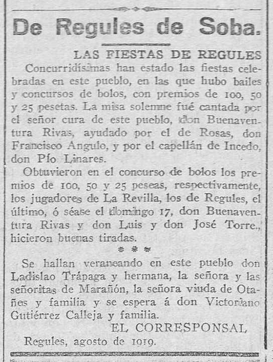 Obtuvieron en el concurso de bolos los premios de 100, 50 y 25 pesetas, respectivamente, los jugadores de La Revilla, los de Regules, el último, ó séase el domingo 17, D. Buenaventura Rivas y D. Luis y D. José Torre, hicieron buenas tiradas.