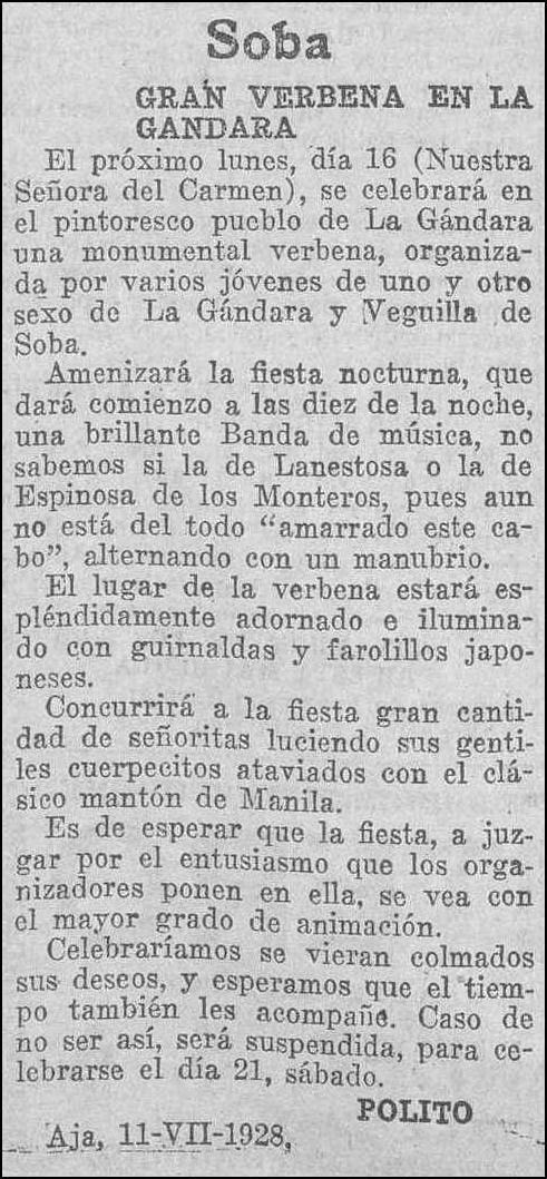 El próximo lunes, día 16 (Nuestra Señora del Carmen), se celebrará en el pintoresco pueblo de La Gándara una monumental verbena, organizada por varios jóvenes de uno y otro sexo de La Gándara y Veguilla de Soba.