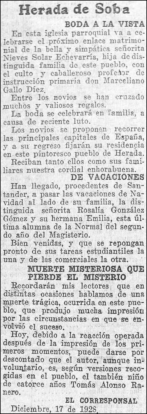 Han llegado, procedentes de Santander, a pasar las vacaciones de Navidad al lado de su familia, la distinguida señorita Rosalía González Gómez y su hermana Emilia, esta última alumna de la Normal del segundo año de Magisterio.