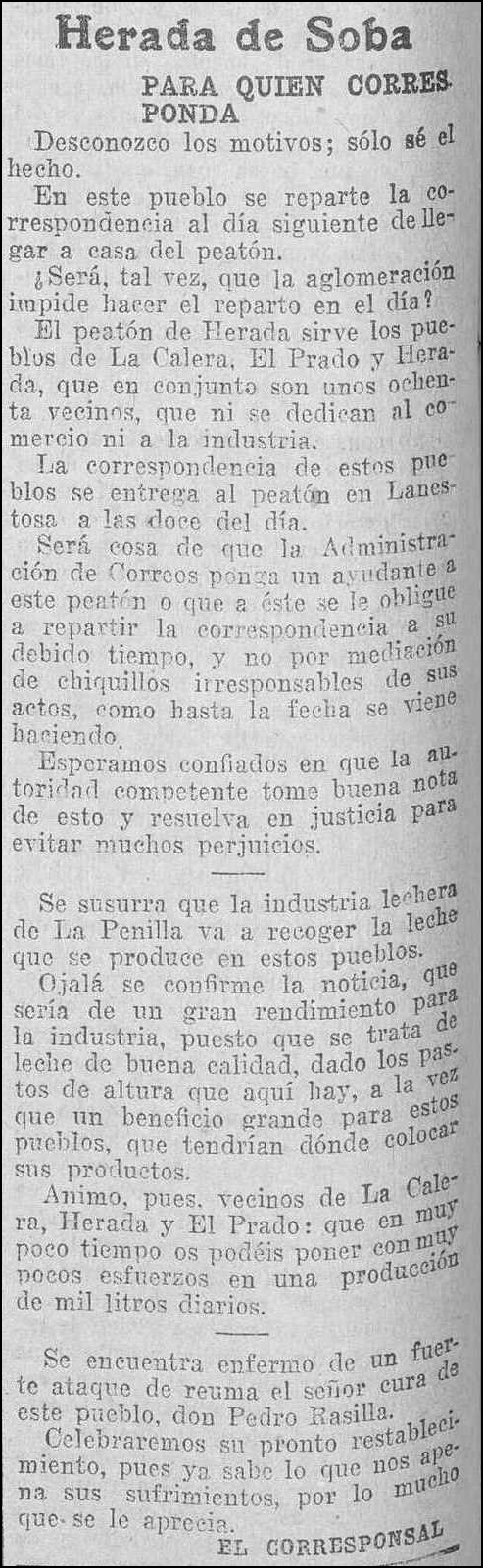 Será cosa de que la Administración de Correos ponga un ayudante a este peatón o que a éste se le obligue a repartir la correspondencia a su debido tiempo, y no por mediación de chiquillos irresponsables de sus actos, como hasta la fecha se viene haciendo.