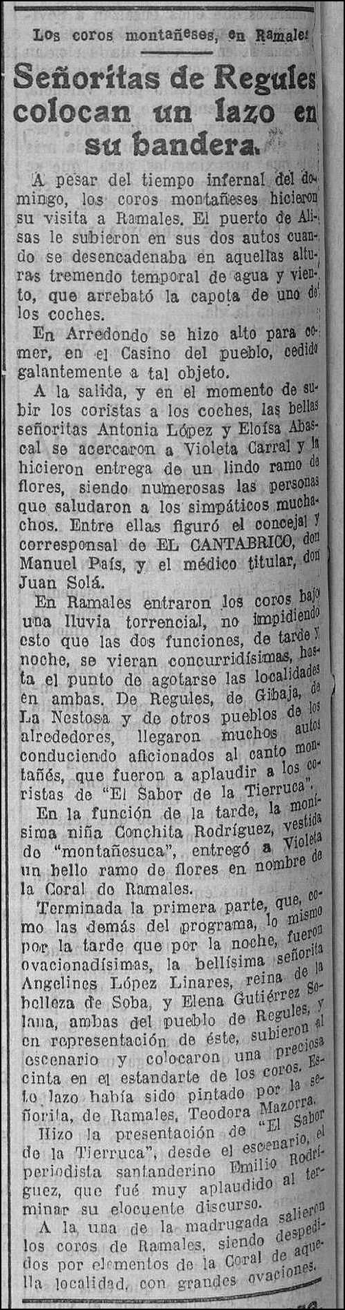 En Ramales entraron los coros bajo una lluvia torrencial, no impidiendo esto que las dos funciones, de tarde y noche, se vieran concurridísimas, hasta el punto de agotarse las localidades en ambas. De Regules, de Gibaja, de La Nestosa y de otros pueblos de los alrededores, llegaron muchos autos conduciendo aficionados al canto montañés, que fueron a aplaudir a los coristas de «El Sabor de la Tierruca».