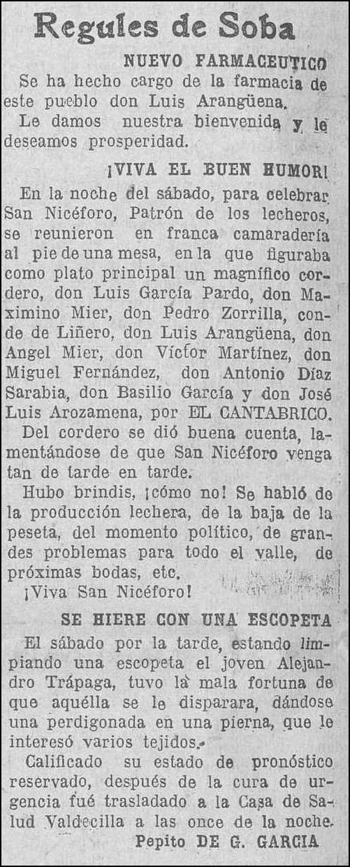 En la noche del sábado, para celebrar San Nicéforo, Patrón de los lecheros, se reunieron en franca camaradería al pie de una mesa, en la que figuraba como plato principal un magnífico cordero, D. Luis García Pardo, D. Maximino Mier, D. Pedro Zorrilla, conde de Liñero, D. Luis Arangüena, D. Ángel Mier, D. Victor Martínez, D. Miguel Fernández, D. Antonio Díaz Sarabia, D. Basilio García y D. José Luis Arozamena, por EL CANTÁBRICO.