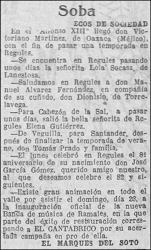 -Existe gran animación en todo el valle por asistir el domingo, día 23, a la inauguración oficial de la nueva Banda de música de Ramales, en la que parte del éxito de restauración corresponde a EL CANTÁBRICO por su acertada campaña en pro de ella.