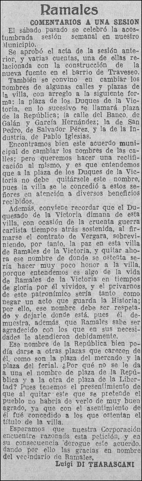 Encontramos bien este acuerdo municipal de cambiar los nombres de las calles; pero queremos hacer una rectificación al mismo, y es que entendemos que a la plaza de los Duques de la Victoria no debe quitársele este nombre, pues la villa se le concedió a estos señores en atención a diversos beneficios recibidos.