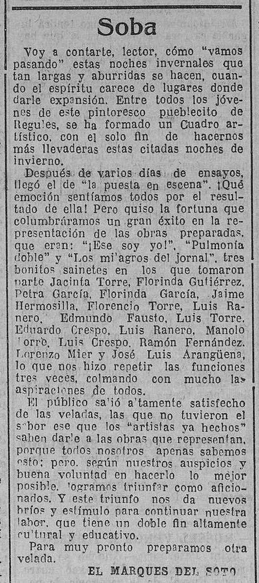 Después de varios días de ensayos, llegó el de «la puesta de escena». ¡Qué emoción sentíamos todos por el resultado de ella! Pero quiso la fortuna que columbráramos un gran éxito en la representación de las obras preparadas, que eran: «¡Ese soy yo!, «Pulmonía doble! y «Los milagros del jornal», tres bonitos sainetes en los que tomaron parte Jacinta Torre, Florinda Gutiérrez, Petra García, Florinda García, Jaime Hermosilla, Florencio Torre, Luis Ranero, Edmundo Fausto, Luis Torre, Eduardo Crespo, Luis Ranero, Manolo Torre, Luis Crespo, Ramón Fernández, Lorenzo Mier y José Luis Arangüena, lo que nos hizo repetir las funciones tres veces, colmando con mucho las aspiraciones de todos.
