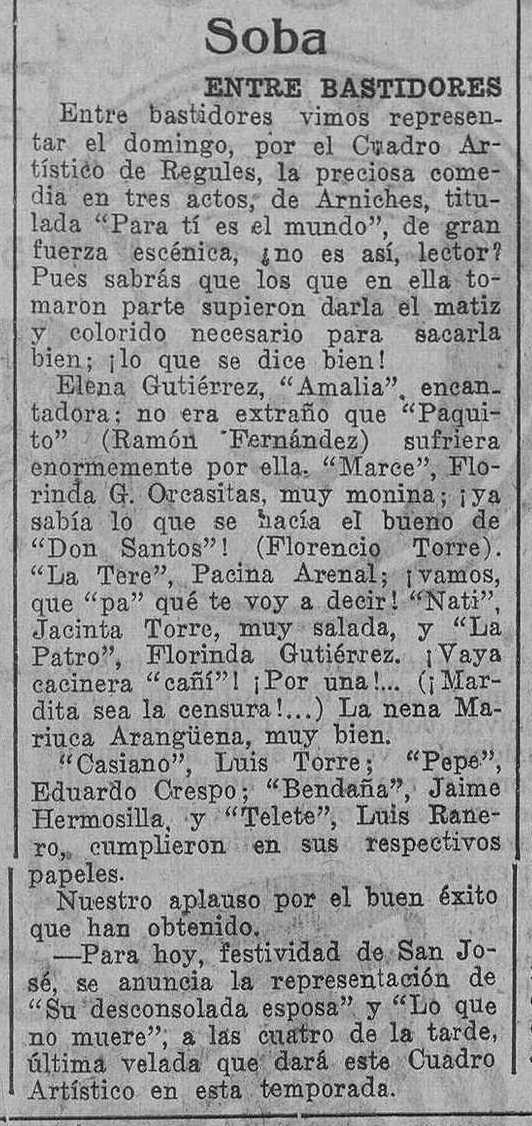 Entre bastidores vimos representar el domingo por el Cuadro Artístico de Regules, la preciosa comedia en tres actos, de Arniches, titulada «Para tí es el mundo», de gran fuerza escénica, ¿no es así, lector? Pues sabrás que los que en ella tomaron parte supieron darla el matiz y colorido necesario para sacarla bien; ¡lo que se dice bien!.