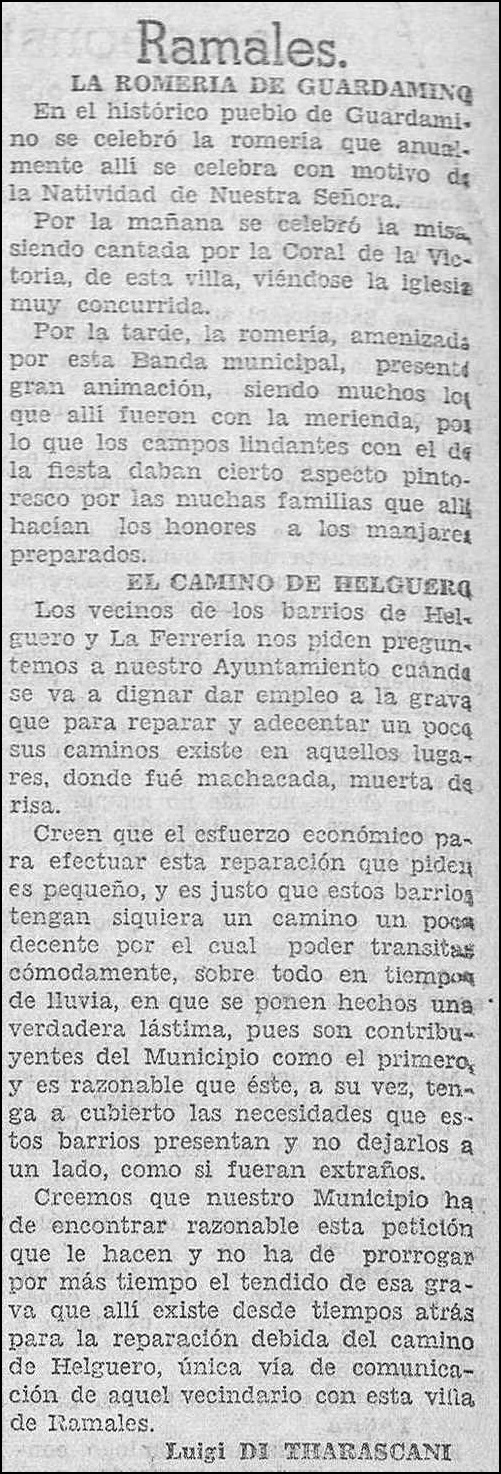 Los vecinos de los barrios de Helguero y La Ferrería nos piden preguntemos a nuestro Ayuntamiento cuando se va a dignar dar empleo a la grava que para reparar y adecentar un poco sus caminos existe en aquellos lugares, donde fué machacada, muerta de risa.