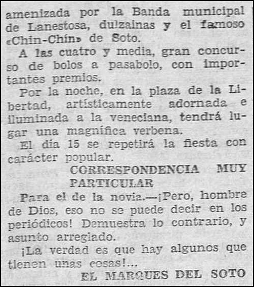 A las cuatro de la tarde, en la plaza de la Constitución, dará principio la acostumbrada romería, que será amenizada pr la Banda municipal de Lanestosa, dulzainas y el famoso «Chin-Chín» de Soto.