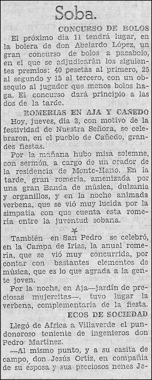 Por la mañana hubo misa solemne, con sermón, a cargo de un orador de la residencia de Monte-Hano. En la tarde, gran romería, amenizada por una gran Banda de música, dulzaina y organillos, y en la noche animada verbena, que se vió muy lucida por la simpatía con que cuenta esta romería entre la juventud sobana.