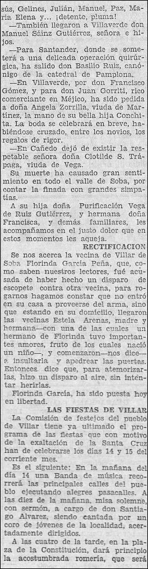 Se nos acerca la vecina de Villar de Soba Florinda García Peña, que, como saben nuestros lectores, fué acusada de haber hecho un disparo de escopeta contra otra vecina, para rogarnos hagamos constar que no entró en su casa a proveerse del arma, sino que estando en su domicilio, llegaron las vecinas Estela Arenas, madre y hermana – con una de las cuales un hermano de Florinda tuvo importantes amores, fruto de los cuales nación un niño – y comenzaron – nos dice – a insultarla y apedrear las puertas. Entonces dice que, para atemorizarlas, hizo un disparo al aire, sin intentar herirlas.