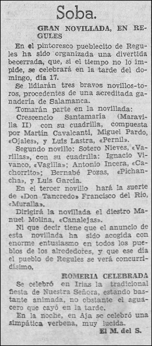 Ni que decir tiene que el anuncio de esta novillada ha sido acogida con enorme entusiasmo en todos los pueblos de los alrededores, y que ese día el pueblo de Regules se verá concurridísimo.