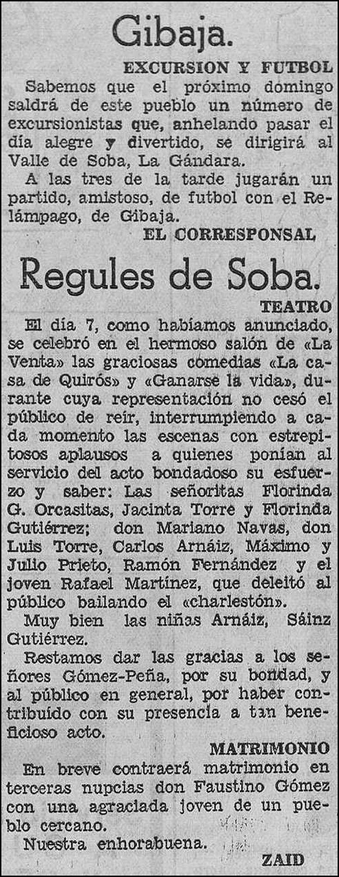 El día 7, como habíamos anunciado, se celebró en el hermoso salón de «La Venta» las graciosas comedias «La casa de Quirós» y «Ganarse la vida», durante cuya representación no cesó el público de reír, interrumpiendo a cada momento las escenas con estrepitosos aplausos a quienes ponían al servicio del acto bondadoso su esfuerzo y saber: Las señoritas Florinda G. Orcasitas, Jacinta Torre y Florinda Gutiérrez; don Mariano Navas, don Luis Torre, Carlos Arnáiz, Máximo y Julio Prieto, Ramón Fernández y el joven Rafael Martínez, que deleitó al público bailando el «charlestón».