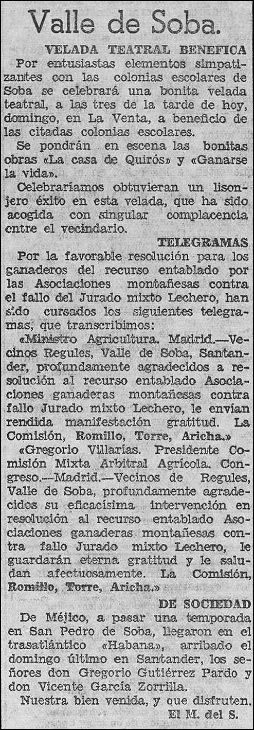 «Ministro Agricultura. Madrid.-Vecinos Regules, Valle de Soba, Santander, profundamente agradecidos a resolución al recurso entablado Asociaciones ganaderas montañesas, contra fallo Jurado mixto Lechero, le envían rendida manifestación gratitud. La Comisión, Romillo, Torre, Aricha«.»Gregorio Villarías.