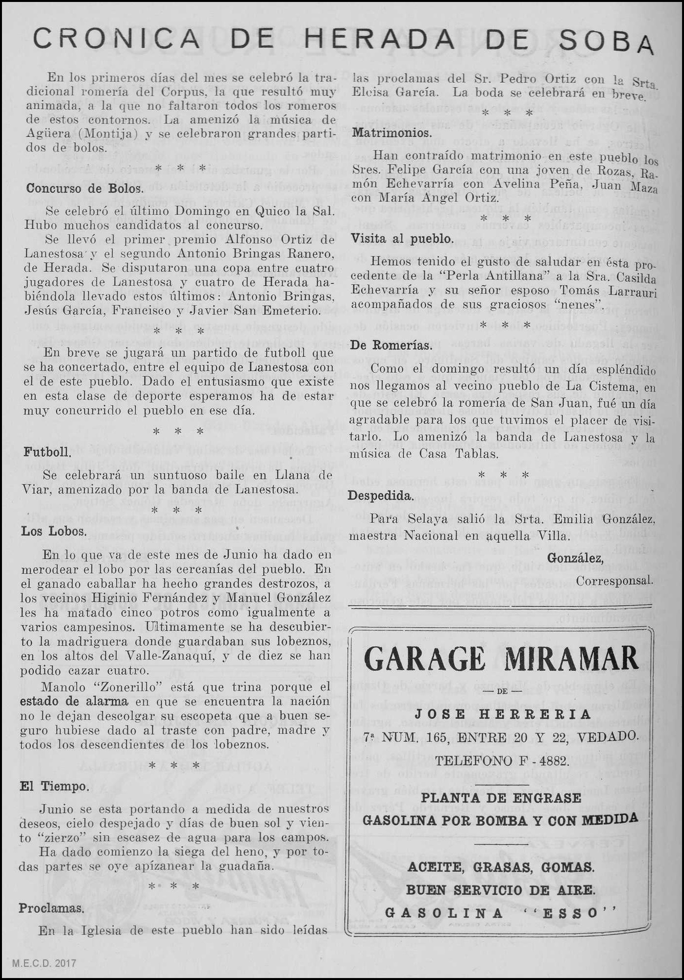 En los primeros días del mes se celebró la tradicional romería del Corpus, la que resultó muy animada, a la que no faltaron todos los romeros de estos contornos. La amenizó la música de Agüera (Montija) y se celebraron grandes paridos de bolos.