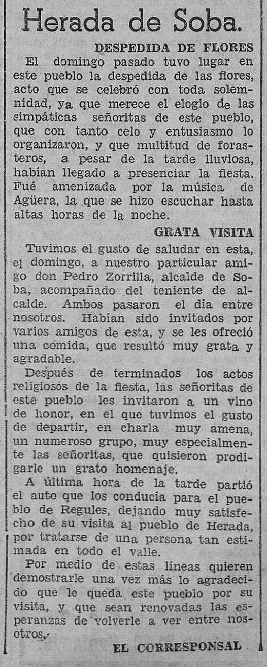 El domingo pasado tuvo lugar en este pueblo la despedida de las flores, acto que se celebró con toda solemnidad, ya que merece el elogio de las simpáticas señoritas de este pueblo, que con tanto celo y entusiasmo lo organizaron, y que multitud de forasteros, a pesar de la tarde lluviosa, habían llegado a presenciar la fiesta. Fué amenizada por la música de Agüera, la que se hizo escuchar hasta altas horas de la noche.