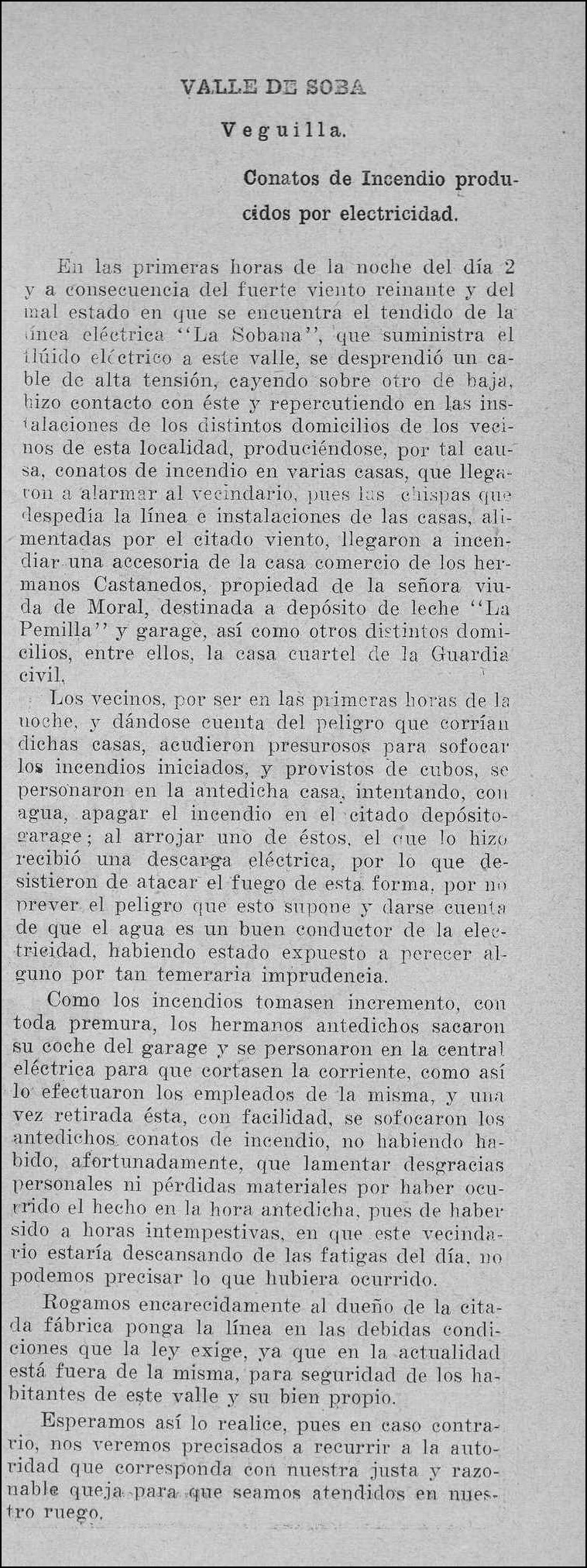 En las primeras horas de la noche del día 2 y a consecuencia del fuerte viento reinante y del mal estado en que se encuentra el tendido de la línea eléctrica «La Sobana», que suministra el fluído eléctrico a este valle, se desprendió un cable de alta tensión, cayendo sobre otro de baja, hizo contacto con éste y repercutiendo en las instalaciones de los distintos domicilios de los vecinos de esta localidad, produciéndose, por tal causa, conatos de incendio en varias casas, que llegaron a alarmar al vecindario, pues las chispas que despedía la línea e instalaciones de las casas, alimentadas por el citado viento, llegaron a incendiar una accesoria de la casa comercio de los hermanos Castanedos, propiedad de la señora viuda de Moral, destinada a depósito de leche «La Pemilla» y garage, así como otros distintos domicilios, entre ellos, la casa cuartel de la Guardia civil.